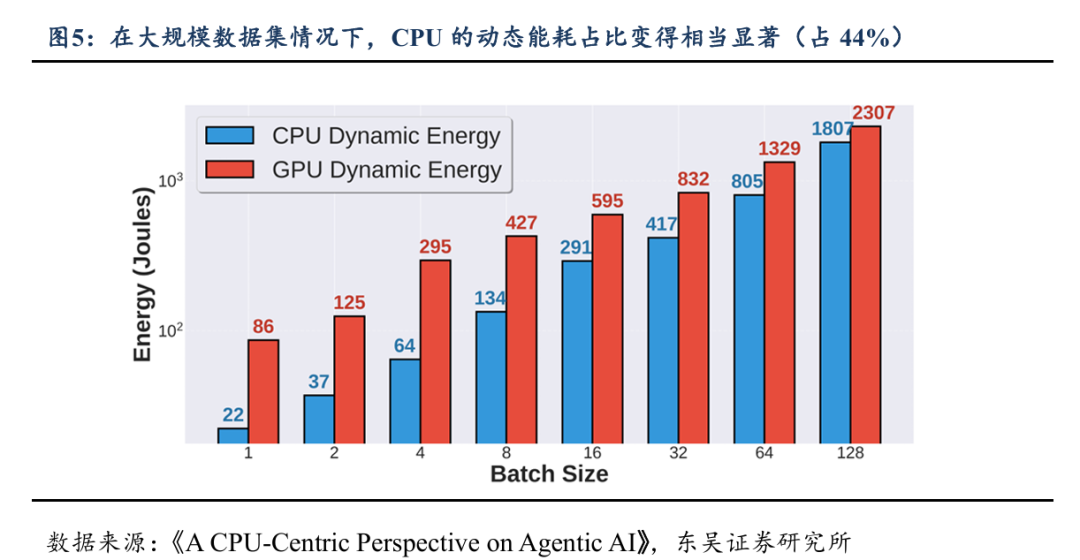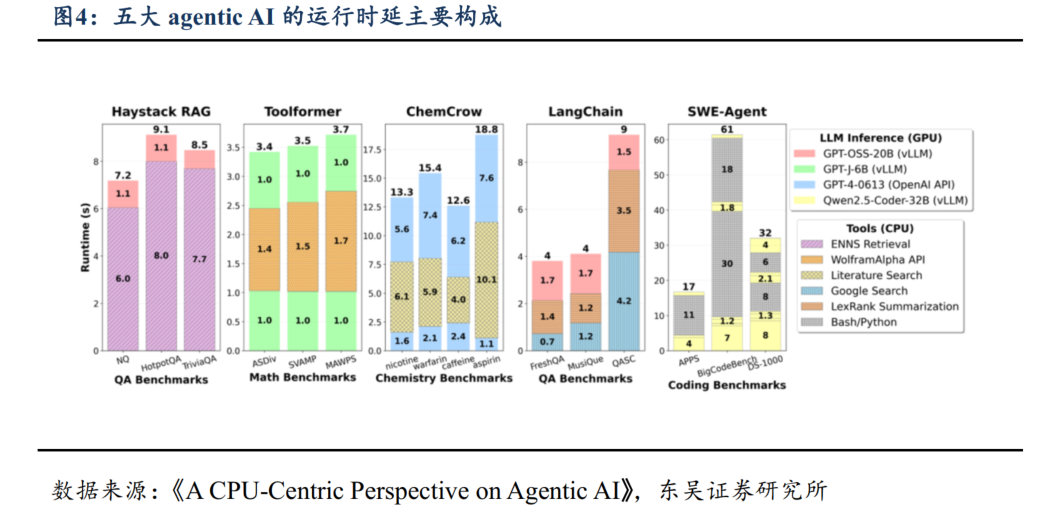 Agentic AI工作负载很大程度上依赖CPU。智能体框架通常包含决策编排器、工具调用、外部 API、数据库访问等复杂逻辑,这些操作往往在CPU上执行。在多种典型agentic workload(如Toolformer、Langchain、ChemCrow等)中,在CPU上处理工具调用可能占总延迟的84.5%-90.6%。CPU动态能耗在大批量agent处理中可占总能耗的近44%,说明工作负载对CPU的依赖度极高。