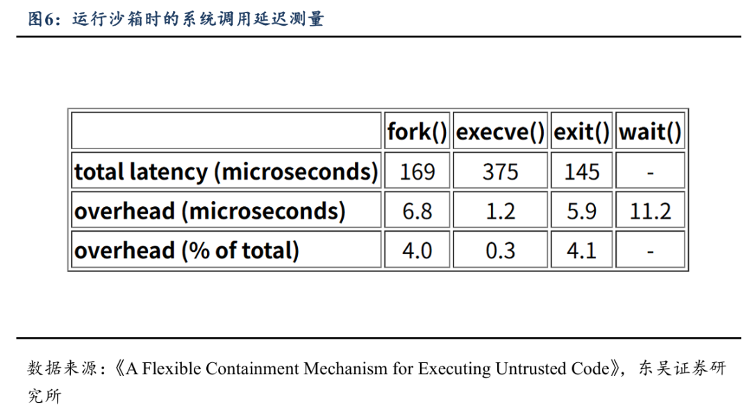 Agentic AI中沙箱会显著提升CPU工作量,增加系统时延。有研究对 fork()、execve()、exit() 等系统调用的延迟进行测量,结果显示,在沙箱机制下,系统调用的延迟明显提高(每次syscall增加数微秒开销):fork() 增加约 6.8 µs;execve() 增加约1.2µs;exit()增加约5.9µs。这在大量频繁短生命周期任务(例如agent调用多个工具/脚本)场景下可被放大为显著CPU工作量。另有研究表明函数执行的冷启动延迟在大量并发沙箱启动时会严重拖慢整体性能,说明隔离机制对CPU调度和资源管理存在高开销。DecentJS的proxy-based sandbox在JavaScript基准测试中表现出8×至32×的执行开销,远高于原生执行。