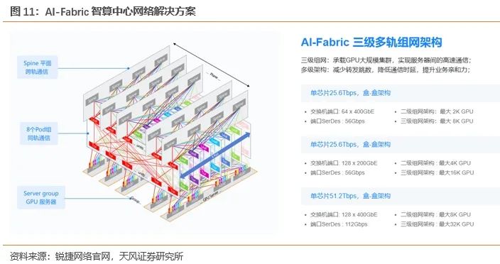 打造AI-Fabric智算中心网络解决方案,赋能大规模组网。锐捷网络AI-Fabric网络解决方案采用多轨组网架构,让同号网卡连接到同一网络Pod组内,使训练业务的流量限定在同一Pod组或同一Tor设备上,从而减少转发跳数,大幅降低网络转发时延;同时为了构建高算力的大规模GPU集群,锐捷网络AI-Fabric网络解决方案采用三级组网,各层级按照1: 1的收敛比的设计,最大可以提供32768个400G端口,实现32K个GPU的集群承载。