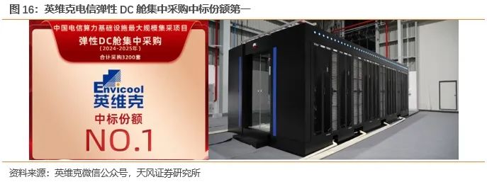 电信DC舱集中采购中斩获份额第一。此前,英维克中标中国电信弹性DC舱(2024-2025年)集中采购项目,该项目合计采购弹性DC舱3200套,共涉及5种DC舱模型,英维克获得第一份额。据悉,此次集采项目是中国电信算力基础设施最大规模集采项目,比上轮集采规模翻一倍,意味着算力基础设施建设将进一步提升。本次中标的英维克DC舱,产品采用模块化设计,由网络机柜、通用结构框架及封闭组件(含天窗通道门、走线槽等)、列间空调、电源列柜、消防联动接口、本地安防(门禁、视频)及本地监控装置等模块化基础设施组成的封闭冷(热)通道T设备舱,能够实现块化快速拼装和快速交付,具有配置灵活、安全可靠、高效节能、智能运维等特点。