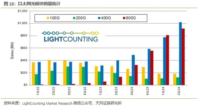 AI带动以太网光模块高增,800G光模块需求旺盛。LightCounting报告显示,2024年第二季度以太网光模块的销售额同比增长了100%。大部分增长来自对400G和800G模块的强劲需求,以太网光模块需求与主要客户-领先的云计算公司的支出密切相关。2024年第二季度,阿里巴巴和Alphabet的支出同比增长超过90%,微软增长55%。Nvidia 的营收同比增长了 122%,Broadcom 的营收同比增长了 47%。同时LightCounting 分析推测800G光模块的需求量预计将在2025年达到1600~1800万只。预计1.6T光模块将在2024Q3~Q4开始出货。根据 Light counting 预测, 800G 光模块有望从 2025 年底开始主导市场。