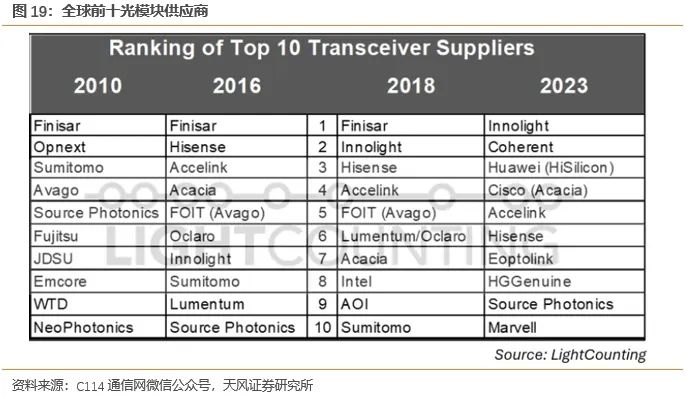 中际旭创为全球光模块龙头。LightCounting公布了最新版2023年全球光模块TOP10榜单,旭创排名第一,中国企业共7家进入十强,分别为旭创科技(排名第1)、华为(排名第3)、光迅科技(排名第5)、海信宽带(排名第6)、新易盛(排名第7)、华工正源(排名第8)、索尔思光电(排名第9)。