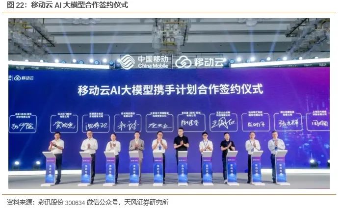 此外在今年7月4日,在2024世界人工智能大会期间,中国移动举办“AI赋能云擎智算”分论坛,中国移动云能力中心与彩讯股份、火山引擎、浪潮、科大讯飞等9家合作伙伴一起,优势互补、资源共享,签署合作协议,携手打造全国最大、最开放的模型生态,为客户提供定制化、高质量的智能模型服务。