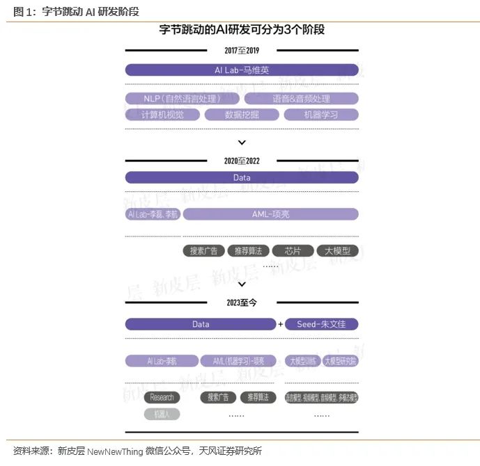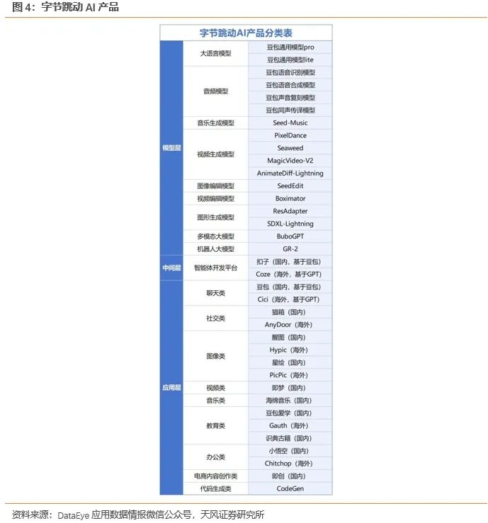 字节AI布局快速发展。实际上,早在2016年,张一鸣就在公司内建立了AI Lab,力邀微软亚洲研究院前常务副院长马维英、华为诺亚方舟实验室原主任李航、自然语言处理技术专家李磊等多位科学家加入,设立了包括计算机视觉(CV)、自然语言处理(NLP)、语音和音频处理、音乐、机器学习等多个子团队,几乎覆盖当时人工智能涉及的所有前沿领域。但后续因为抖音、Tik Tok等核心应用的绝对优势市场地位,AI Lab在字节的位置松动了,变成了服务于抖音这一应用的技术团队。导致字节,在大模型领域反应较为“迟钝”,而2023年紧急成立的Seed团队,某种程度上承担了AI Lab最初成立时被赋予的角色:理解和抓住眼下最前沿的人工智能技术。2023年开始重新对于大模型的投入,是积极的,不仅在人才端抢人,应用端也在抢用户,也使得字节AI布局实现了快速地发展。