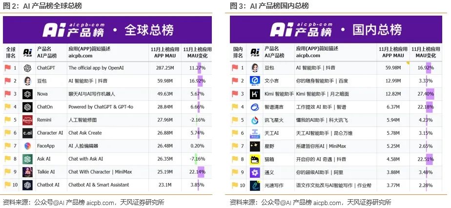 豆包用户数持续快速增长。根据11月AI产品榜全球总榜,字节旗下AI智能助手豆包排名全球第二,MAU达到近六千万;在国内总榜中更是显著领先于其他应用产品,成为榜首。国内AI应用如文小言、KIMI、智谱等均有不错的MAU增长,国内AI应用体现出强有力的增长动能。