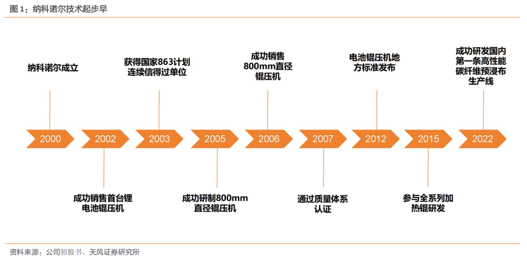 公司专注于锂电辊压设备的研发与生产。2000 年,纳科诺尔成立,在成立之前,公司主要从事于镍氢电池辊压设备的生产;而因对锂电行业发展看好,遂在成立后专注于锂电辊压机的研发与制造,并在 2002 年成功销售首台锂电池辊压机,开始打造锂电辊压设备产品系列;2003 年经过国家质检总局审批获得国家 863 计划动力电池配套设备连轧生产线连续质量信得过单位。