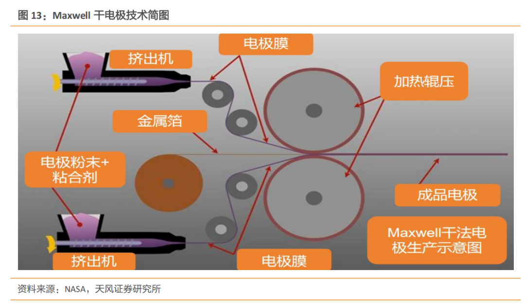 2)干法电极工艺:一种锂离子电池制造发新工艺,在电极的制程中不采用溶剂,通常是将正/负极活性物质、导电剂与固态粘结剂直接混合后,直接喷涂到集流体上,或者通过不同的工艺制成自支撑膜后与集流体复合。