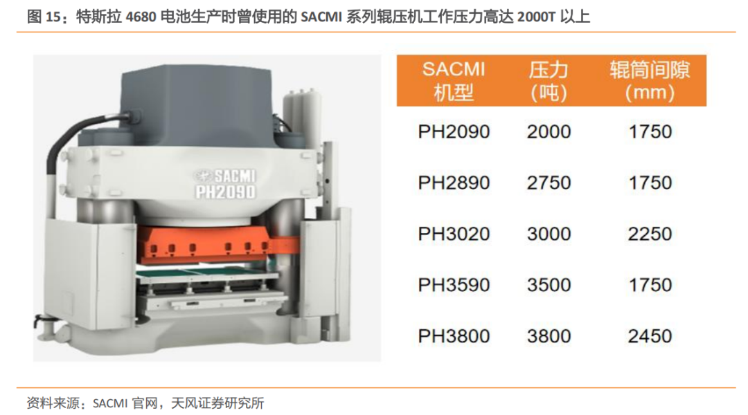 相较传统湿法工艺,在干法工艺中,将自支撑膜辊压到金属箔上需要更高性能的辊压设备。正极材料活性较高,在干法工艺的辊压过程中不稳定性较高、易发生化学反应,并且辊压后自支撑膜容易掉粉,这要求辊压机有更高的厚度控制和压力均匀性。此外,干法电极制备不用溶剂,会出现固-固界面阻抗过大的问题,得用更大的外力进行抵消,因此干法工艺需要更大压力的辊压机。被认为是特斯拉 4680 干法电池曾使用的 SACMI 辊压机工作压力在 2000T 以上,远高于一般湿法辊压机。