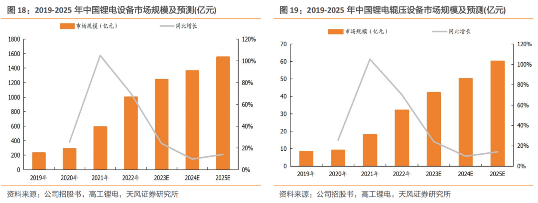 锂电设备市场规模步步走高,撬动干法电极设备未来成长。根据高工锂电统计,2022 年中国锂电生产设备市场规模约为 1000 亿元,同比增长 70.1%,主要是由于国内锂电池企业海外业务扩张、扩产加快。其中,2022 年中国锂电辊压设备市场达 32 亿元,同比增长 77.8%,至 2025 年预计将达到 60 亿元,2022-2025 年 CAGR 达 23.3%。在后续锂电池产能持续增长、设备迭代需求旺盛的背景下,中国锂电辊压设备市场预计将持续扩大,不俗的增量市场有望为干法电极设备提供良好的市场基础。