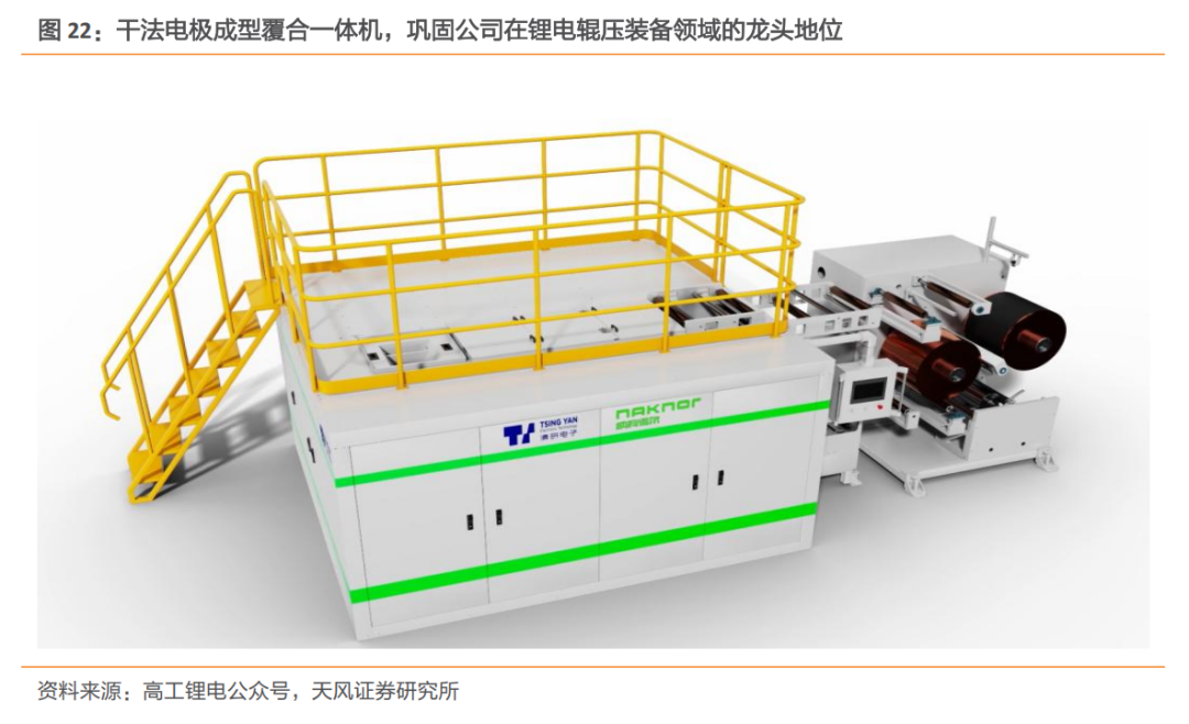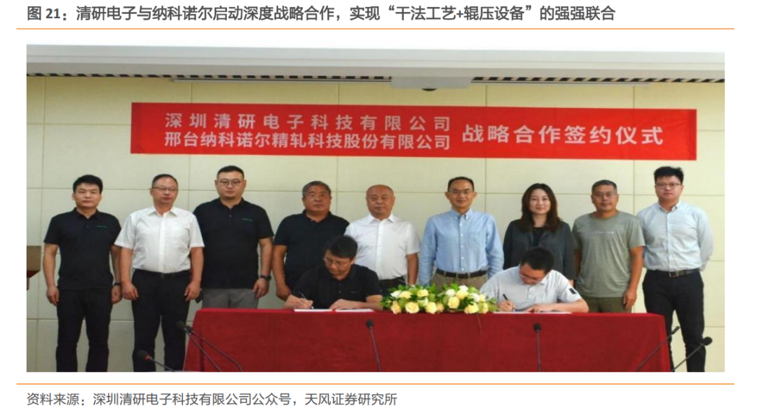 竞争力如何:1)纳科诺尔本身在辊压设备上技术领先,我们推断其在宁德、比亚迪的辊压设备需求占比较高。2)纳科诺尔合作的清研电子孵化自深圳清华大学研究院,核心人物王臣教授是国内权威的干法专家。3)干法电极技术本身对材料(均匀度等)和设备(工作压力、辊压精度等)均提出了更高的要求,双方优势互补。