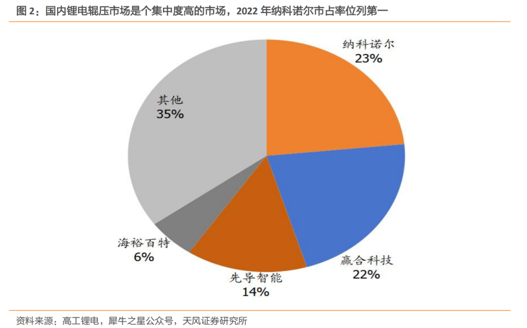 纳科诺尔深耕锂电辊压设备领域多年,在国内市场占据优势。根据高工锂电的数据,锂电辊压设备行业集中度较高,2022 年国内锂电辊压设备行业 CR3 为 59.4%,其中纳科诺尔排名第一,市占率高达 23.4%。