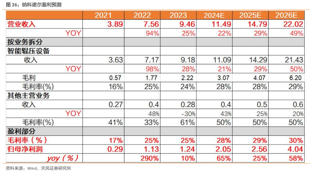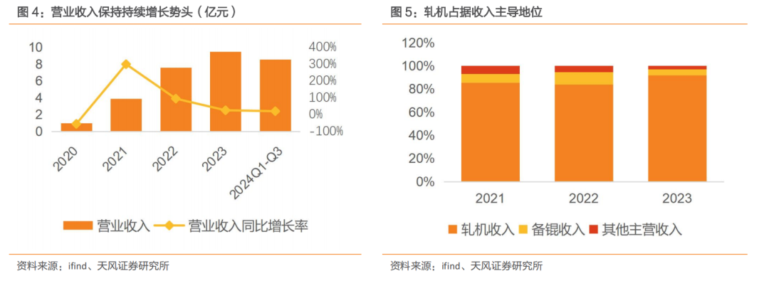 轧机是主要收入来源。纳科诺尔营业收入从 2020 年的 0.98 亿元,上涨到 2023 年的 9.46亿元,2022 相较 2020 年增长 671%,2023 年的同比增长率则为 25.03%,2020-2022之间出现井喷式增长的主要原因是新能源汽车行业的快速发展,锂电池生产企业不断扩大产能,受下游锂电池生产企业扩张产能的影响;2023 年上涨的主要原因是国内动力市场状态比较稳定,整体行情景气度较高。