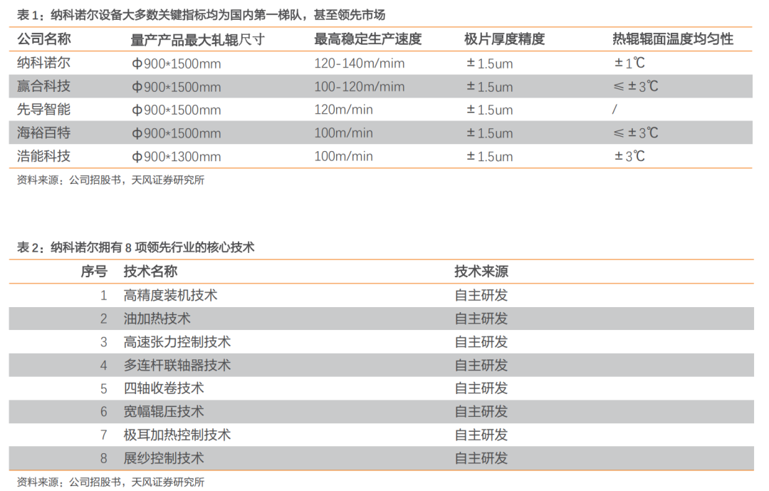 纳科诺尔的技术积累属于行业内领先水平。纳科诺尔目前已形成 8 项具有竞争优势的核心技术,包括高精度装机技术、油加热技术、高速张力控制技术、多连杆联轴器技术、四轴收卷技术等技术。此外,公司辊压设备轧辊尺寸、生产速度、厚度精度各项关键指标,均处于国内第一梯队,甚至领先市场。在追求高性能的干法电极设备领域,深厚的技术底蕴给了纳科诺尔推陈出新的强大动能。