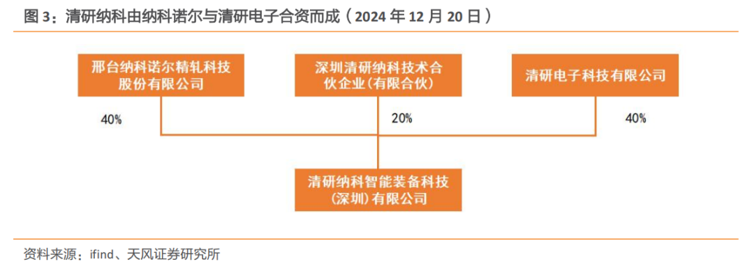 清研纳科股权结构较为集中:清研纳科是 2023 年由清研电子与纳科诺尔进行共同合资而成的,清研电子占股 40%,纳科诺尔占股 40%,清研纳科自身占股 20%。清研电子是深圳清华大学研究院储能重点实验室通过科技转化,内部孵化的一家创新性高科技企业,其在近两年将“粉体干法成膜”技术成功应用于超级电容器和锂离子电池的电极制造领域,实现绿色制造;而纳科诺尔则是锟压机的专精特新小巨人企业,纳科诺尔与清研电子早在 2009年就有合作,同时在 2022 年达成了深度战略合作,专注于“动力电池用干法电极”的研究与合作。