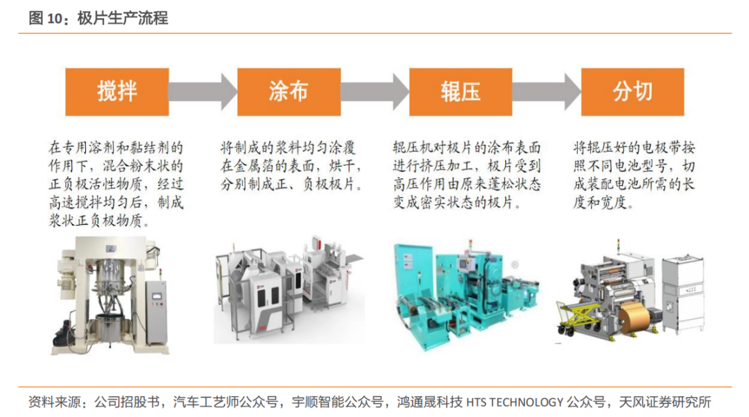 极片生产是锂电池生产的前段工艺部分,旨在打造涂覆有正负极活性物质的极片,是对电池性能影响最大的环节之一。在传统工艺中,极片制造主要包括搅料、涂布、辊压、分切几个步骤,这几个步骤设备价值共占全流程的 40%。而干法工艺则是一种全新的极片制备方式,最大特点在于制备过程无需溶剂。