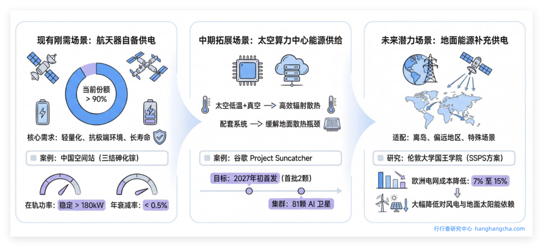 现有刚需为航天器自备供电,占比超90%,满足轻量化和抗极端环境需求,支撑在轨装备稳定运行。