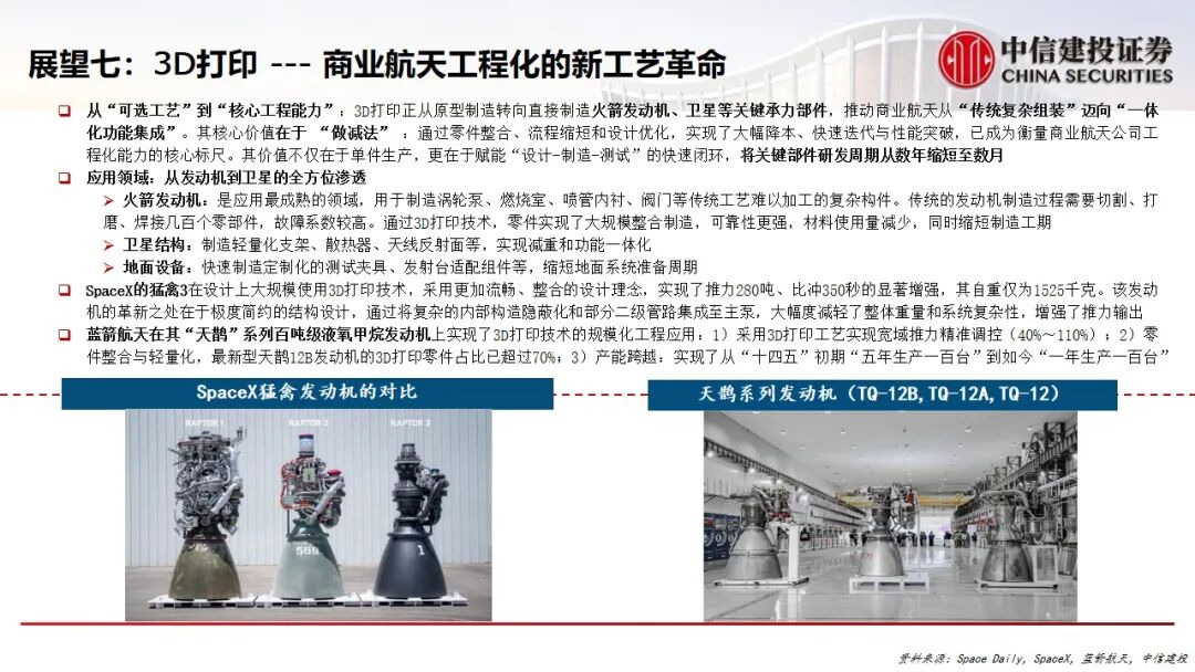 7.3D打印成为核心工艺革命:该技术从原型制造转向直接制造火箭发动机、卫星结构等关键承力部件。通过零件整合与设计优化,实现大幅降本、快速迭代,成为衡量企业工程化能力的核心标尺。