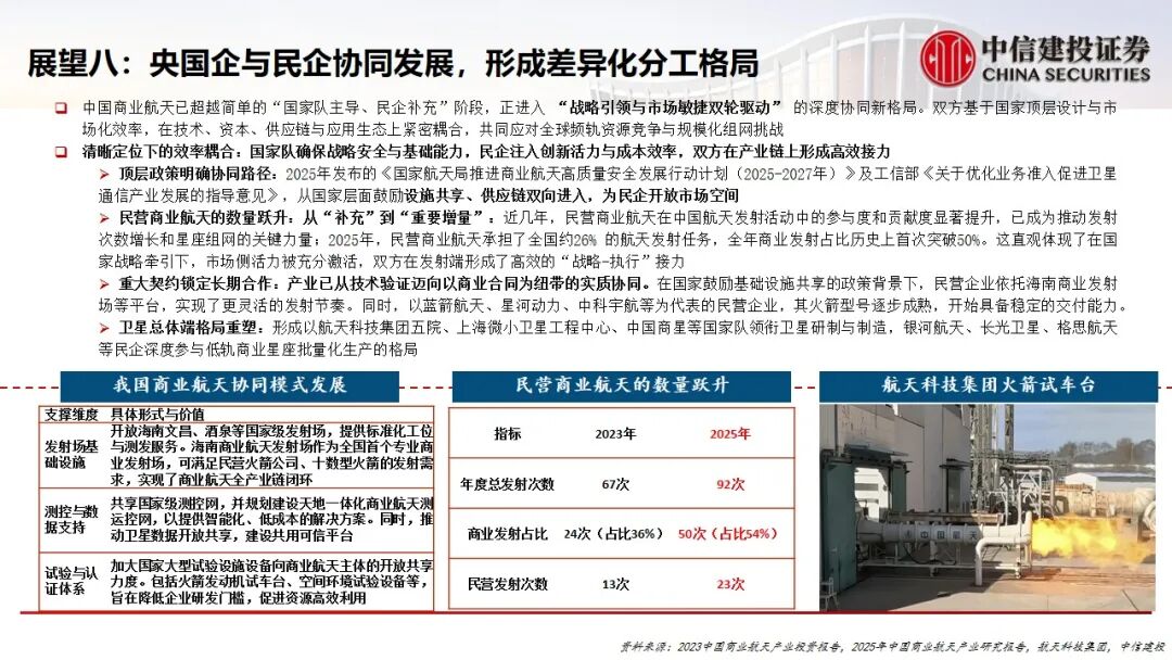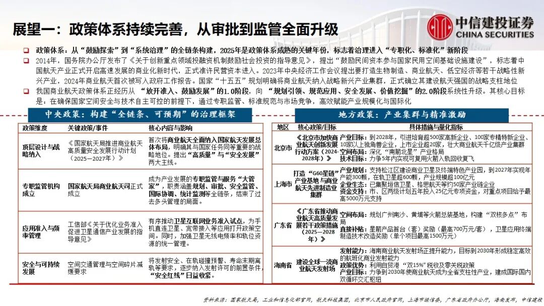 1.政策体系持续完善:2025年是我国商业航天政策体系成熟的关键年份。国家航天局设立商业航天司并印发专项行动计划,标志着行业监管从“鼓励探索”进入“系统治理、专职标准化”的新阶段,为核心技术与应用落地提供明确指引。