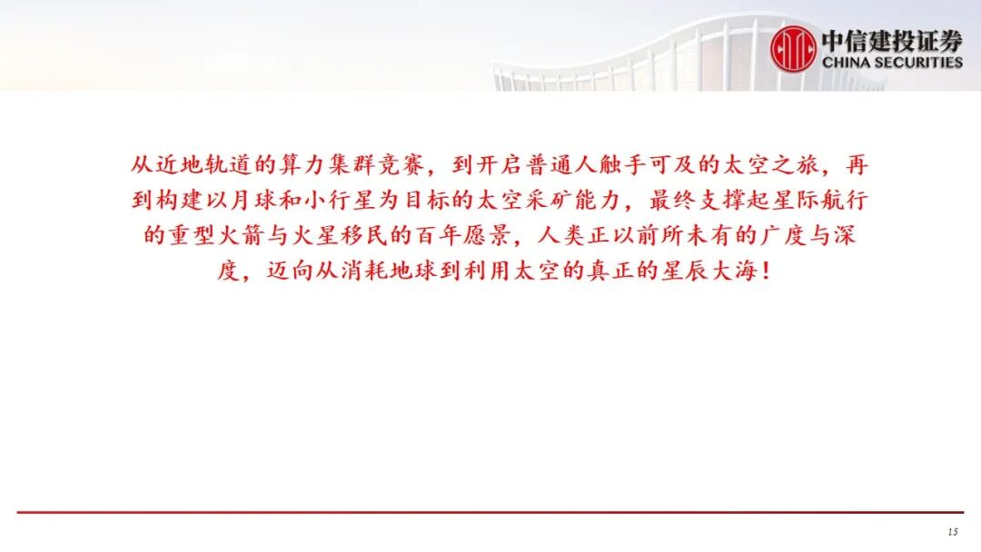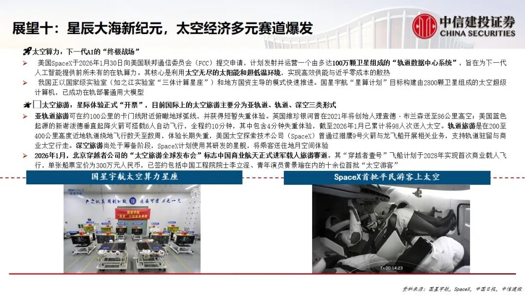 10.太空经济开启多元赛道爆发:产业边界极大拓展,前沿领域包括:太空算力(如轨道数据中心)、太空旅游(亚轨道、轨道及深空旅行)、重型运载器研发以及火星移民等长远愿景,迈向真正的“星辰大海”新纪元。