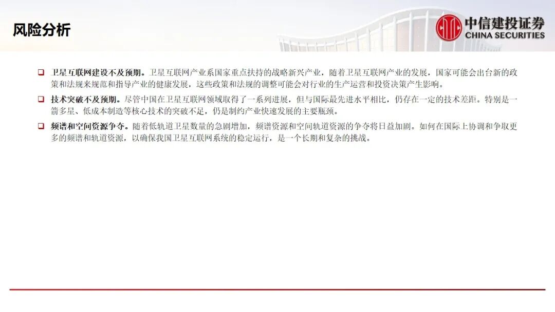 技术突破不及预期。尽管中国在卫星互联网领域取得了一系列进展,但与国际最先进水平相比,仍存在一定的技术差距。特别是一箭多星、低成本制造等核心技术的突破不足,仍是制约产业快速发展的主要瓶颈。