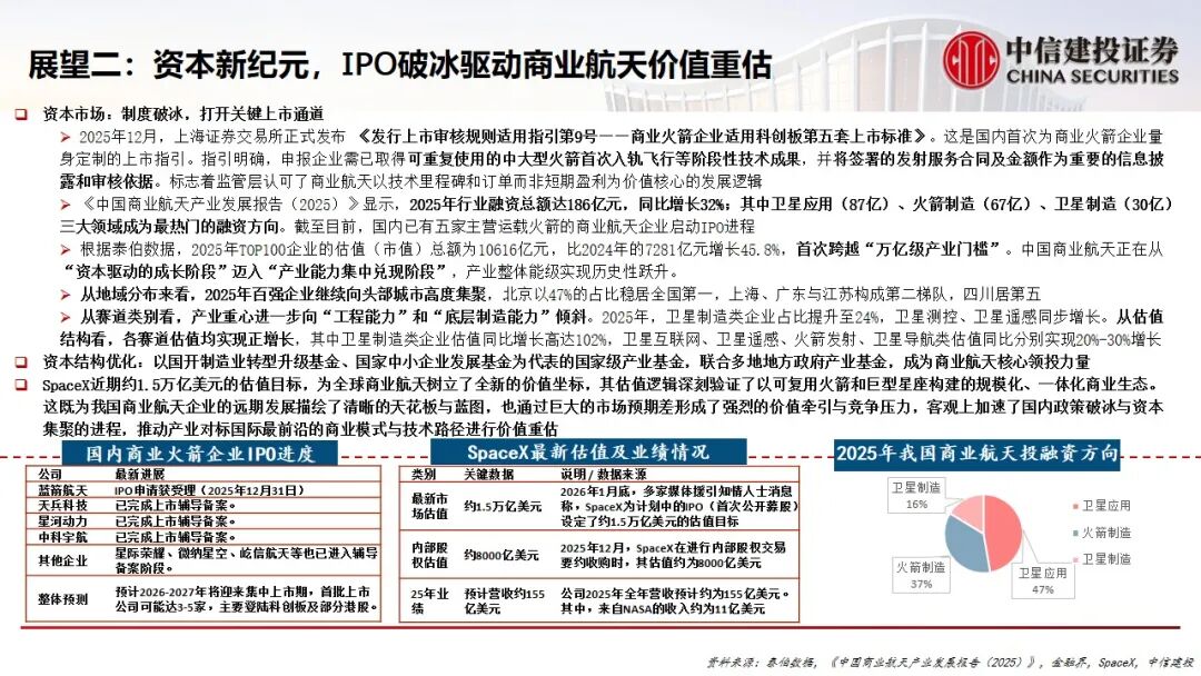 2.资本新纪元与IPO破冰:上海证券交易所发布专项指引,首次为商业火箭企业(适用科创板第五套标准)打开上市通道。2025年行业融资总额达186亿元,TOP100企业总估值突破万亿门槛,显示资本正驱动产业从成长阶段迈向能力兑现阶段。