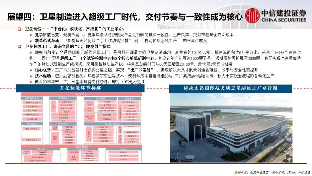 4.卫星制造迈入“超级工厂”时代:竞争焦点转向批量生产的效率与一致性。以海南文昌卫星超级工厂为代表,采用自动化脉动生产线,目标年产能可达千颗,实现“出厂即发射”,推动制造范式革命。