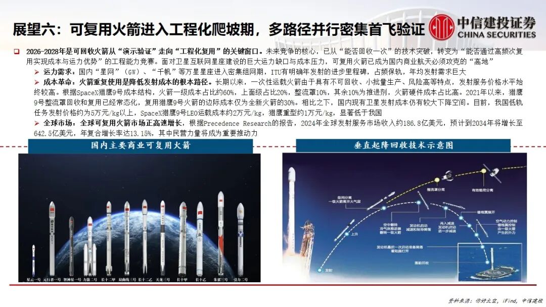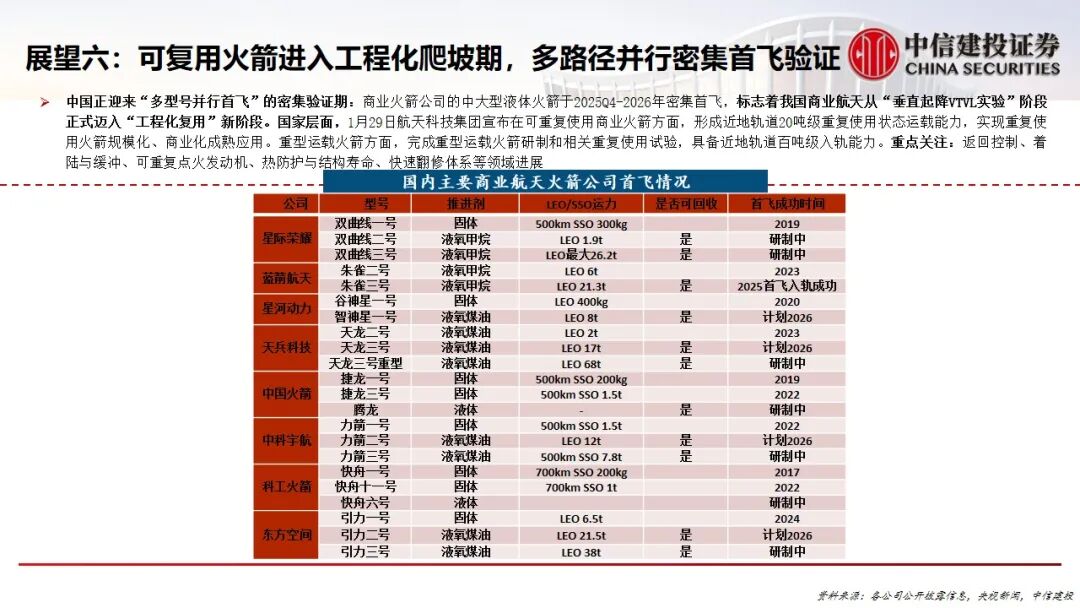 6.可复用火箭进入工程化爬坡期:竞争核心从“能否回收”转为“能否高频次复用”。国内多型中大型液体火箭在2025-2026年密集首飞,旨在攻克可复用技术以应对星座建设产生的巨大运力与成本压力。