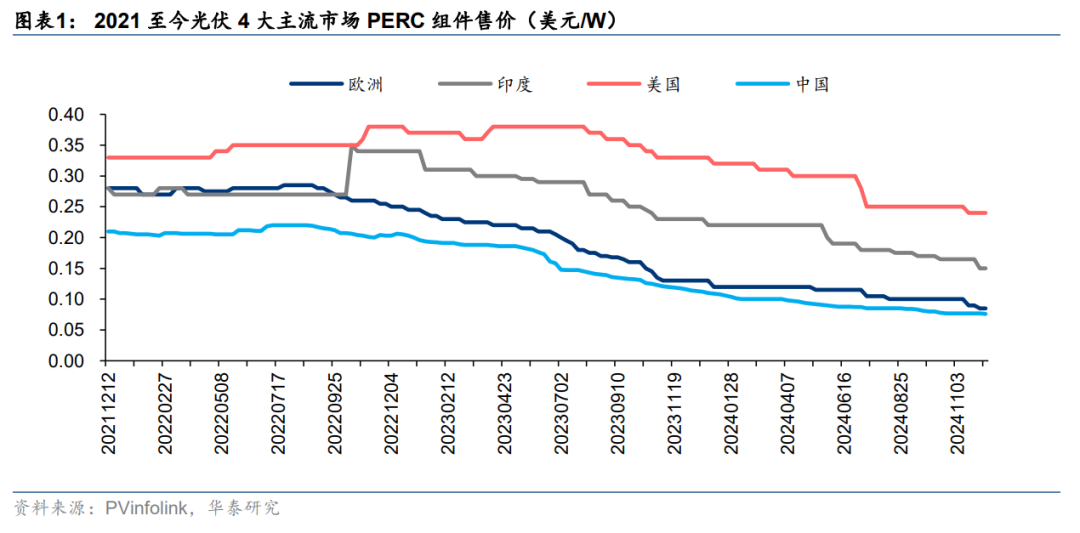在全球光伏产能过剩背景下,海外市场高溢价的来源是人为的关税贸易壁垒。美国、欧盟、印度等国家和地区均对中国光伏产品发起过“双反”调查、保障措施或关税壁垒。2011年以来,美国商务部对来自于中国大陆的晶硅光伏电池及组件发起“双反”调查,开始对相关光伏产品征收保证金。2022年印度政府决定对进口光伏组件/电池分别征收40%/25%的关税。2024年6月,美国政府宣布取消双面光伏组件的201关税豁免。人为的贸易壁垒抬高了美国/印度等国家的光伏组件售价,而相对进入门槛较低的欧洲市场,其光伏价格则被充分竞争到与国内光伏组件几乎持平的低价。