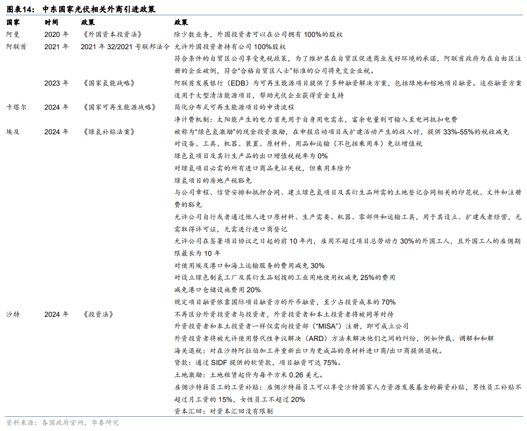政策端积极提供便利,寻求光伏投资国际合作。沙特阿拉伯、开曼、阿联酋三个中东光伏巨头均在近年放开了对外籍法人持股比例的限制,意味着外国投资者现在可以在本土公司拥有100%的股权。除此之外,各国还采用了简化注册手续、本土员工补贴等手段吸引国际投资。埃及发布的《绿氢补贴法案》将国际融资方的外币融资占比超过70%作为可享受优惠政策的前提条件之一。