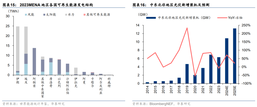 近三年中东北非地区装机复合增速超40%。根据世界能源统计年鉴,排除埃及与伊朗主要依靠水力,MENA地区整体光伏占可再生能源发电量比重为75%。根据BNEF统计,2023年中东北非光伏新增装机6.3GW,24/25年新增光伏装机或达到10.9GW/13.2GW,对应24-25年CAGR为44.6%。
