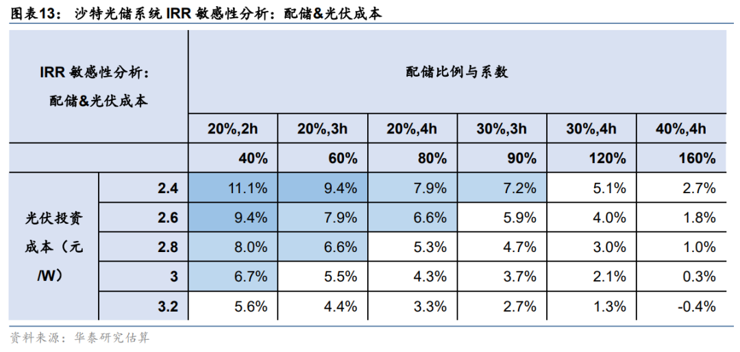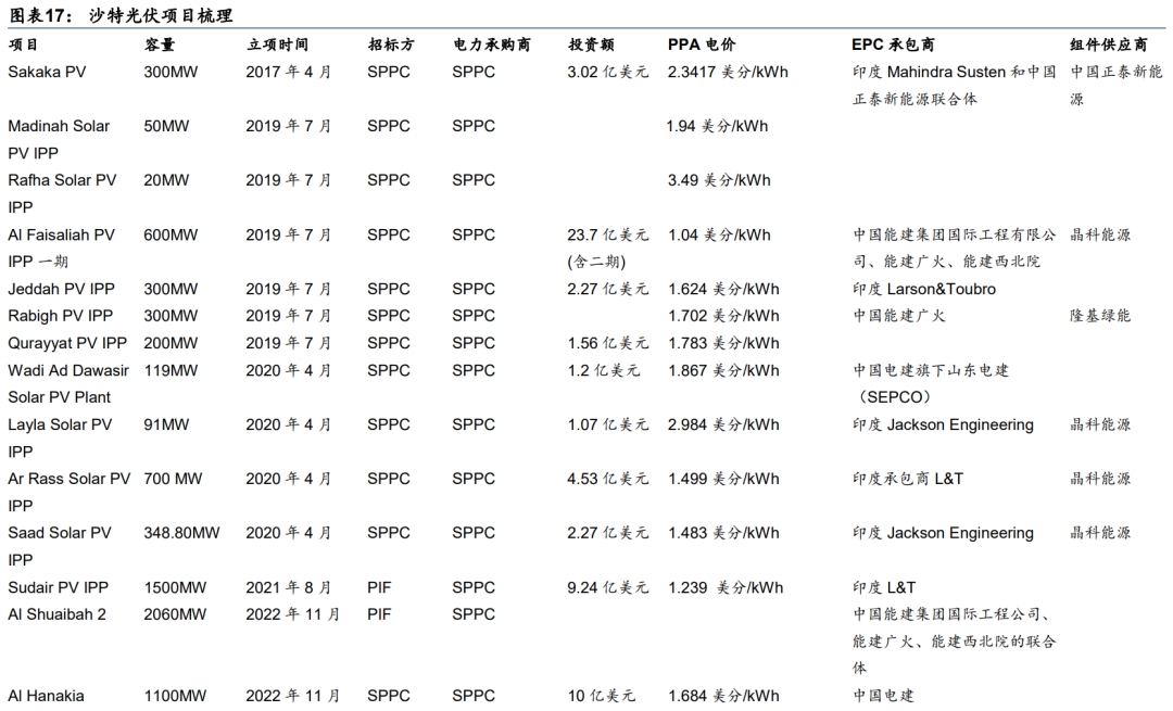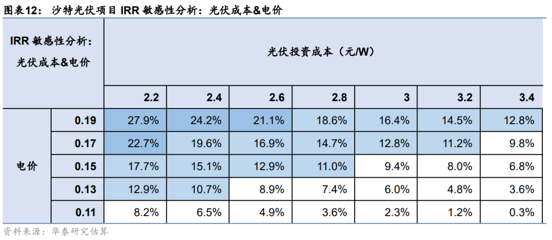 资源禀赋佳 光伏项目成本低。我们以沙特为例,对中东的光伏项目的IRR进行了测算。假设光伏每年有效利用小时数为2500h,光伏投资成本为2.8元/W,其中光伏组件成本为0.8元/W,项目使用年限为25年,光伏PPA电价为0.15元/kWh,无相关补贴,我们计算得到光伏项目的IRR为11%,经济性较好,未来有望进一步放量。
