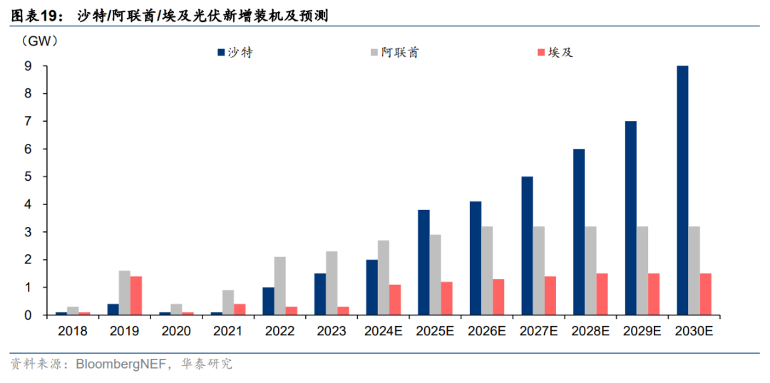 中东光伏累计装机有望快速增长,2030年或达180GW。根据MESIA,截至2023年,中东地区的光伏装机容量为32GW,预计2024年达到40GW,2030年达到180GW,年均增长率30%。分国家来看,沙特/阿联酋/埃及23年新增装机分别为1.5/2.3/0.3GW,预计24年将增长至2.0/2.7/1.1GW,增速较快。考虑到BNEF预测基于沙特2030年新能源装机58GW的装机目标,考虑到沙特已将目标上调至130GW,我们预计沙特未来5年内每年光伏新增装机容量将接近/超过10GW。