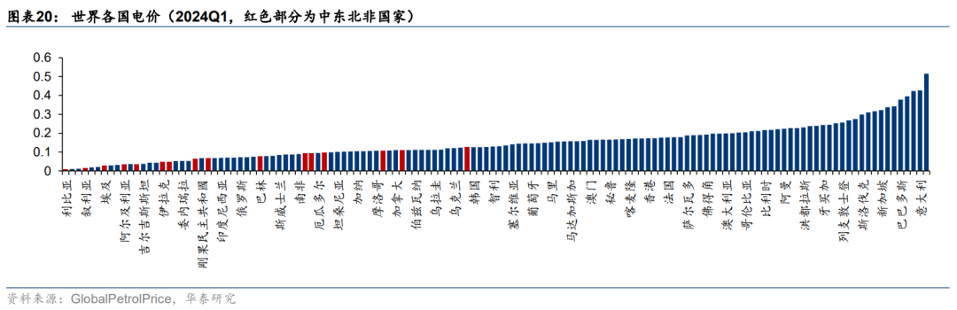 能源成本低廉:中东具有丰富的油气资源优势,传统能源价格较低,电价同样较低。光伏产业链中,电力成本为整体生产成本的重要组分,尤其是硅料/玻璃等高能耗环节。中东地区的低廉电价和能源价格提供了组件生产端的优势。