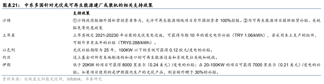 全球本土化制造趋势抬头,不排除中东增加对制造本土化程度要求的可能。在全球光伏产能过剩的大背景下,本土化制造在新一轮光伏出海进程中的重要性格外凸显,中东地区亦有此趋势。土耳其规定2021-2030年安装的光伏发电设施,可获得为期10年的固定电价补贴(TRY 1.06/kWh),若采用本土生产的组件,可额外享有五年的补贴(TRY0.288/kWh)。沙特方面同样有扶植本地开发商,放松对本地太阳能面板制造商的限制的相关政策。目前各主要厂商定向订单的比例越来越高,多个国家招标光伏项目开始溯源供应链。我们认为,未来本地制造、绿电项目、易就地消纳、有当地服务团队支持和光储一站式方案的产能或更受青睐。中东市场光伏需求快速起量,若贸易保护政策抬头,提前布局产能于高增速的中东光伏蓝海市场将是重要利好。