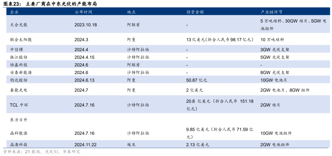 海外高溢价市场尤其是美国向来为各光伏企业出海必争之地。根据PVinfolink,截至2024年12月,美国PERC组件价格为0.24美元/w,约为国内价格的三倍。由于美国对中国产能制造的光伏产品设立了较高关税壁垒,此前中国光伏企业多选择在东南亚建厂输美。然而美国双反裁定落地后,我国主要企业在东南亚四国(越南、泰国、马来西亚、柬埔寨)的光伏产能将面临平均53%的税率,东南亚四国输美优势削弱。而美国本土光伏产能仍有缺口。中东地区不受美国双反裁定限制,产能绕道中东或可维持高溢价市场份额,获取超额利润。