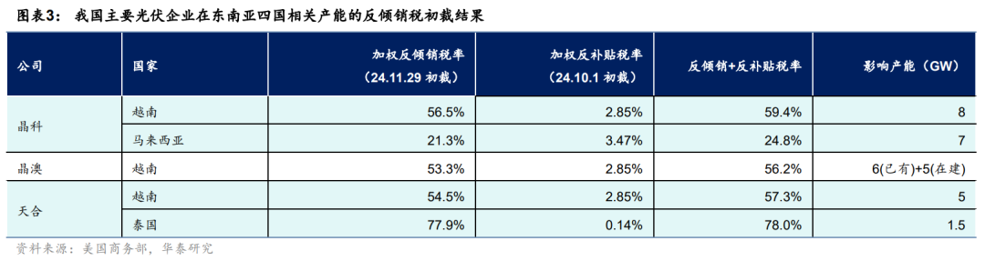 双反初裁涉及国内主要企业税率平均53%,东南亚输美优势大幅削弱。2024年5月,美国商务部启动对东南亚四国(越南、泰国、马来西亚、柬埔寨)的双反调查,其中反补贴初裁结果已于10月公布。11月29日,美国商务部公布东南亚四国反倾销税率初步裁定结果,涉及国内主要企业相关产能的税率落在21.3%-77.9%区间内,平均值为53%;整体反倾销税率区间为0%-271.3%,平均值为83%。双反税率初裁落地后,东南亚四国输美不再有优势,美国组件的高价带来的超额利润被高昂的税收拉齐。因此,中国光伏企业想要继续获取美国市场超额利润仅能依靠美国本土产能或绕道其他海外非东南亚四国产能。