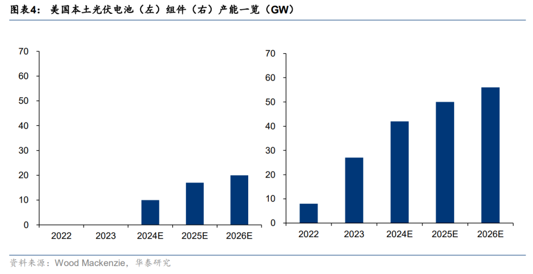美国本土光伏产能仍有缺口。根据 Wood Mackenzie 数据,当前美国本土有 20GW 太阳能电池产能正在规划中,但相比 60GW 的需求,依然有40GW 的缺口。而这些产能至少需要两到三年的时间来建造和爬坡,因此短期内不太可能有产出,美国太阳能市场中长期产能缺口仍大。