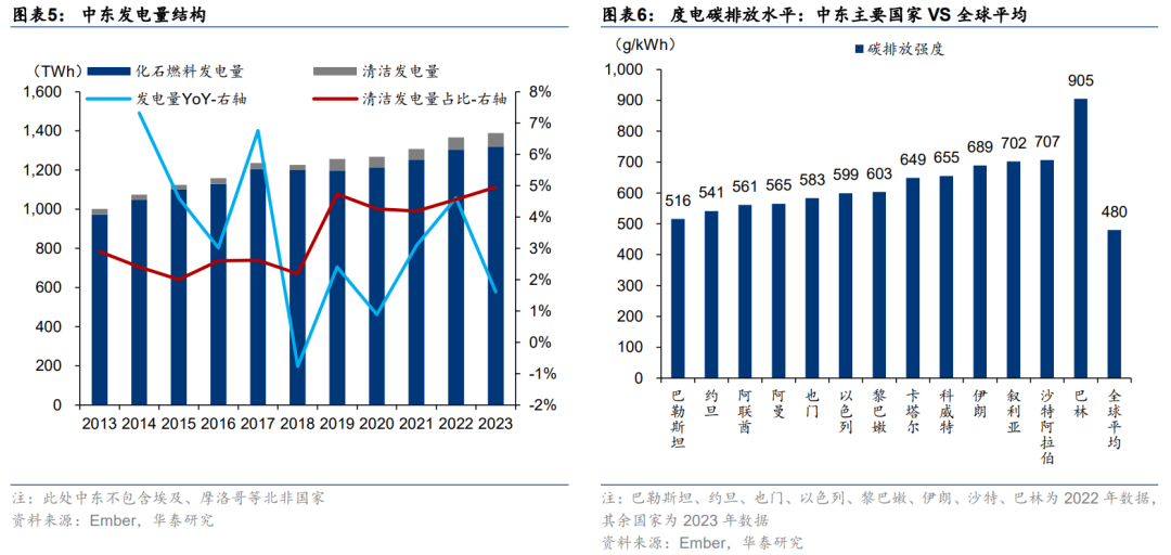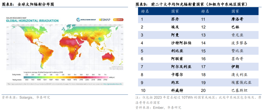 中东光照资源禀赋优越。中东地区以热带沙漠气候为主,年均光照强度超过2000kWh/m2,该地区接收的全部太阳能占地球太阳能资源的22%-26%,其中沙特年均光照强度高达2200-2400kWh/m2,阿联酋年均日照时间超过3500小时。在2023年电力需求超过10TWh的国家或地区中,平均阳光辐射量前二十的国家主要集中在中东地区。而以阿联酋、埃及、沙特为代表的中东国家坐落在发电潜力图的右下角,其平均阳光照射强度远高于其他国家,而光伏发电量占比不足5%,未来发展潜力较大。
