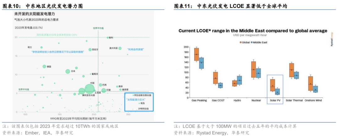 中东光伏度电成本显著低于全球平均。新兴市场项目建设成本普遍更低,叠加丰富的光照资源、广袤的土地资源,以及当地政府积极的补贴政策,中东地区度电成本显著低于全球平均。据Rystad Energy,全球光伏发电成本平均约42MWh,而中东国家平均仅为18MWh。