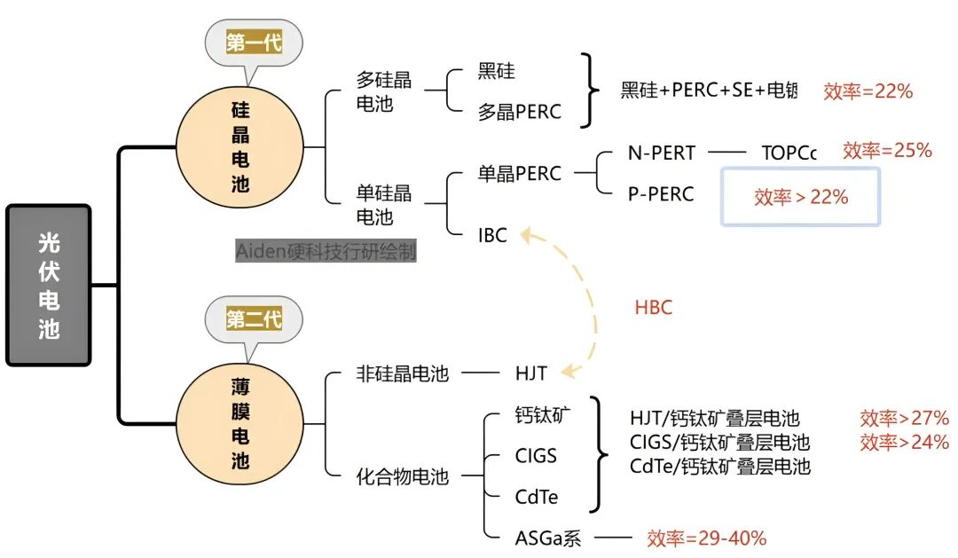 ① 硅基路线:以硅材料(如单晶硅、多晶硅)为光吸收层,通过硅的半导体特性实现光电转换。常见技术包括传统晶硅电池(如PERC)、异质结电池(HJT)等,利用硅与不同材料(如非晶硅、氧化物)形成的异质结结构提升性能。硅基路线的商业化效率约17%-25%。