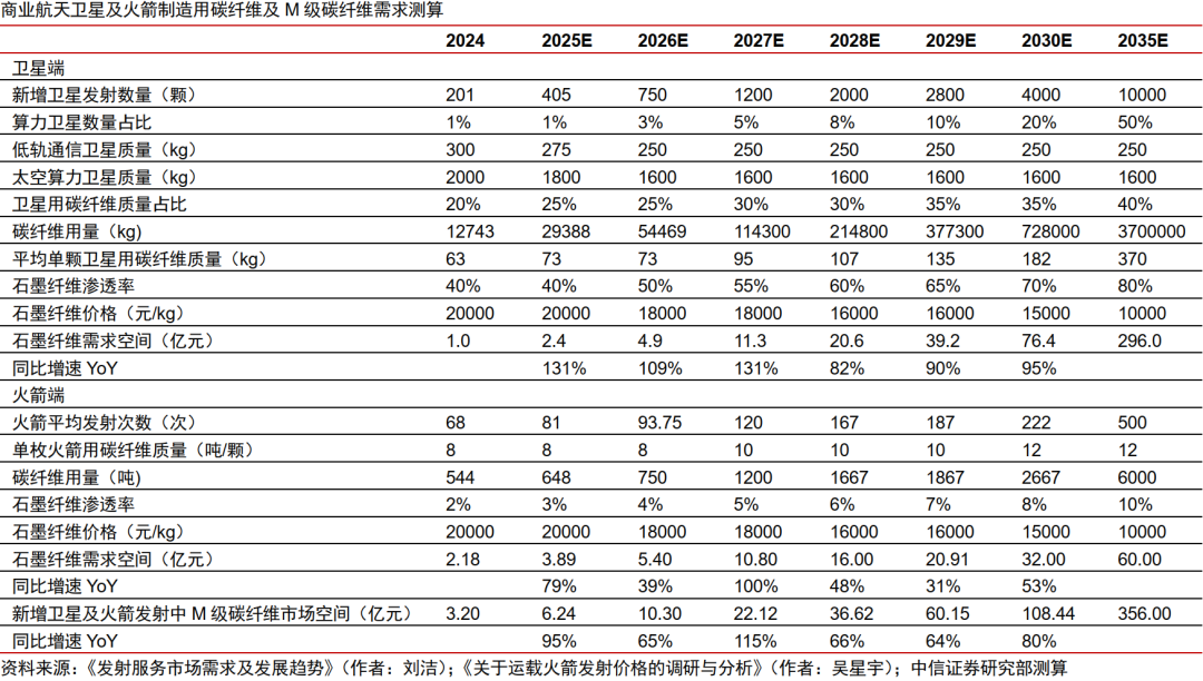 从需求端看,我们预计2030年我国商业航天用M级碳纤维市场规模约110亿元,对应2025-2030年CAGR为77.5%;2035年市场规模有望达356亿元,空间广阔。