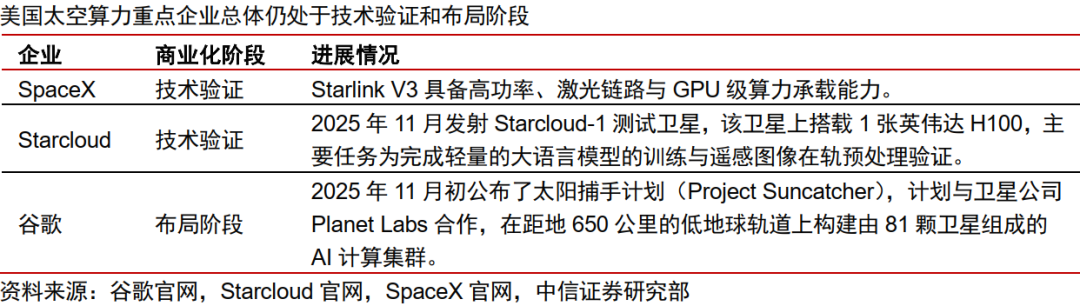 海外巨头纷纷布局太空算力,我国仍处于追赶阶段。当前国际市场上,Starlink、OneWeb、Kuiper等系统占据主导地位。2025年5月14日,太空计算卫星星座搭载长征二号丁运载火箭在酒泉卫星发射中心成功发射,标志着我国首个整轨互联的太空计算星座正式进入组网阶段。11月27日,北京市科委联合中关村科学城管理委员会等单位发布《太空数据中心建设规划方案》,计划在700-800公里晨昏轨道分三阶段建设超千兆瓦级太空数据中心系统,首颗试验星“辰光一号”计划于2025年底或2026年初发射。