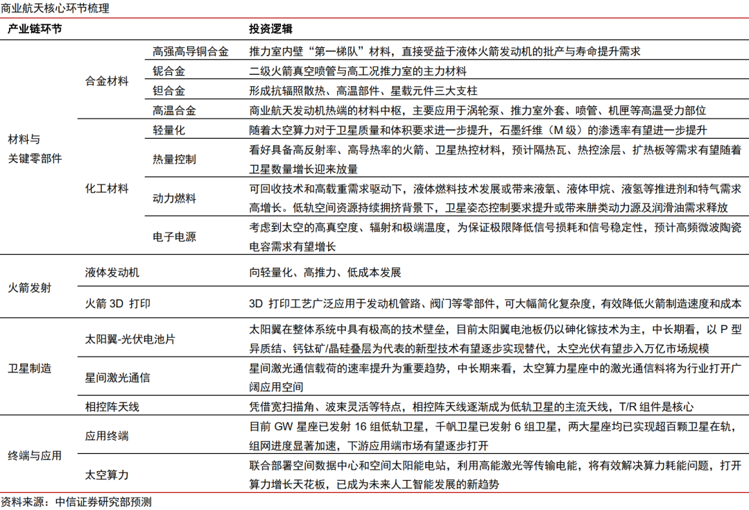 投资端,目前锐度较高的方向是可回收火箭、spaceX链、太空算力,而低轨通信卫星链是最先有基本面逻辑和订单支持的细分领域。我们认为投资端应更聚焦核心资产,寻找“通胀环节”及“边际新增”方向,看好火箭3D打印、卫星射频天线、卫星碳纤维复材、太阳翼、星间激光通信等相关标的。
