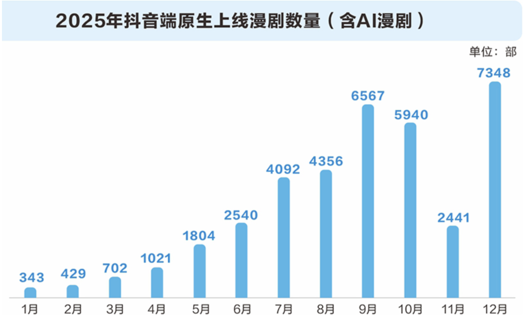 据漫剧有数统计,漫剧核心供给平台抖音端2025年原生上线漫剧(含AI漫剧)达37583部;其中下半年上线量合计突破3万部。