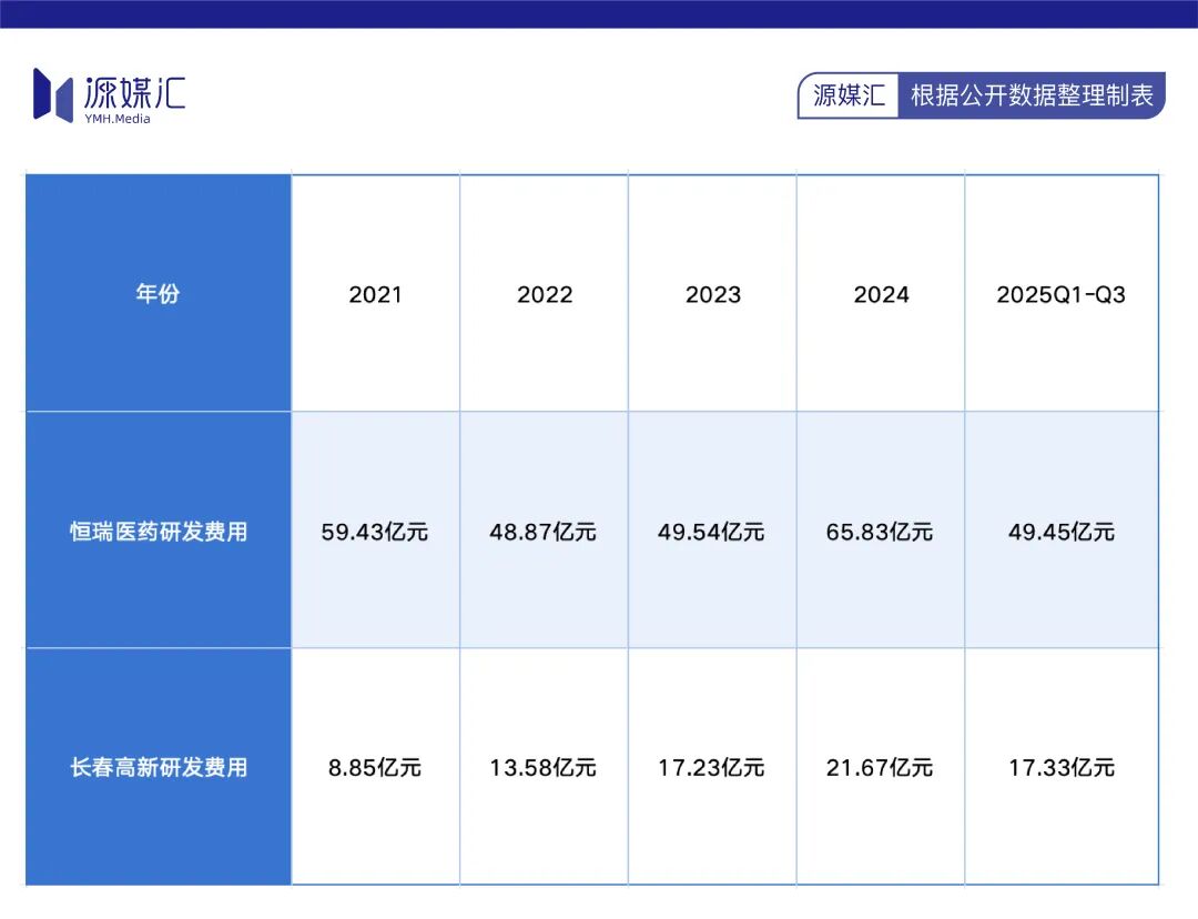 相比之下,长春高新的研发费用虽从2021年的8.85亿元增长至2024年的21.67亿元,但绝对值仅约为恒瑞医药同期投入的三分之一,双方差距仍较为明显。