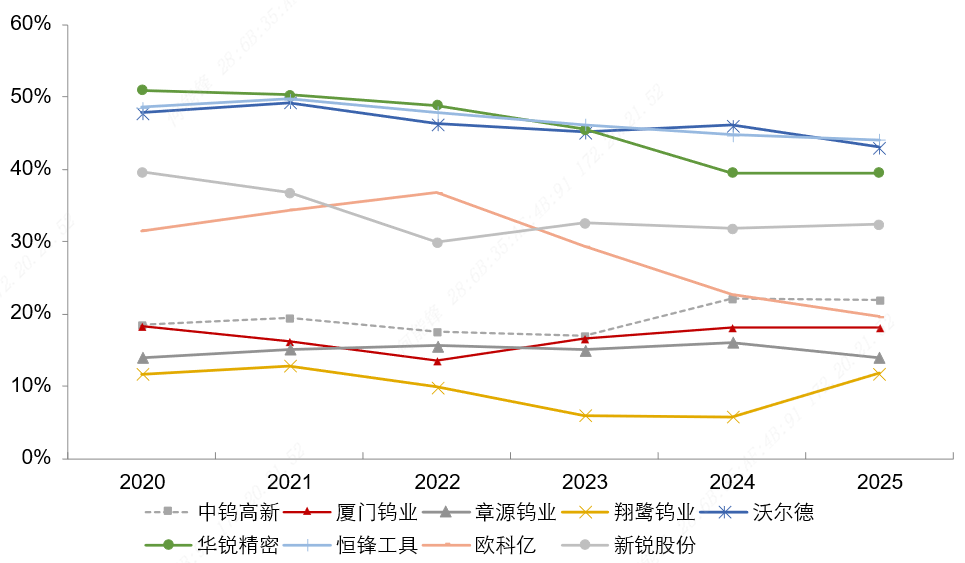 在中国总量控制及出口管制政策压制供应情况下,海外采购依赖度难减。我们预计,2026年海外钨矿(非中资控制)新增产能或不足5000吨(WO₃ 65%),海外有望提供持续而强烈的采购意愿,为钨价中枢抬高给予支撑。2025年随着钨原料价格攀升,刀具厂商有多轮集中调价,2025年三季度销售毛利率回升或持稳表明钨原料价格正根据厂商产品及成本结构逐步传导。2026年1月各厂商产品跟进钨原料价格上涨的调整加快,需进一步关注终端需求反馈。钨资源话语权提升支撑钨价高位,长期仍需依赖下游产业链控制力度提升。从海外钨矿投产节奏看,我们认为5-10年内难以撼动中国在钨产业链的强势地位,钨价高位运行或将支持中国钨产业整体升级,完成高端硬质合金刀具的国产替代、产品出海。