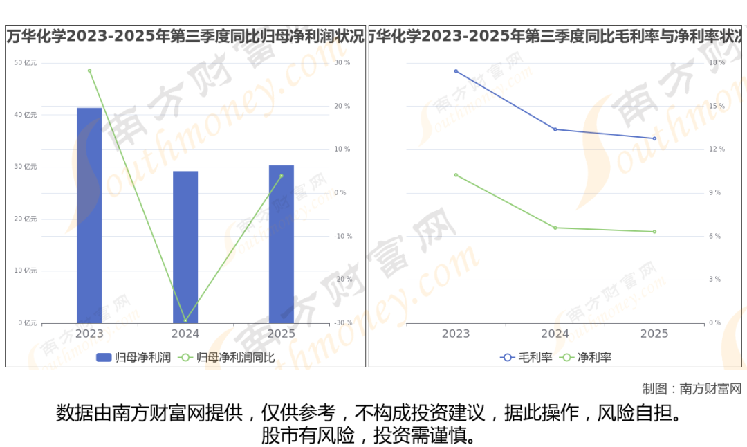 2025年第三季度季报显示,万华化学公司实现净利润30.35亿,同比上年增长率为3.96%,毛利率12.77%。