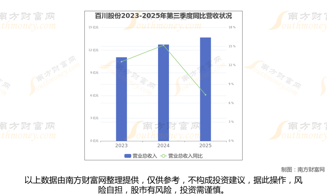 百川股份2025年第三季度报告显示(如上图),公司实现主营业务收入13.67亿元,较去年同期增长7.32%。