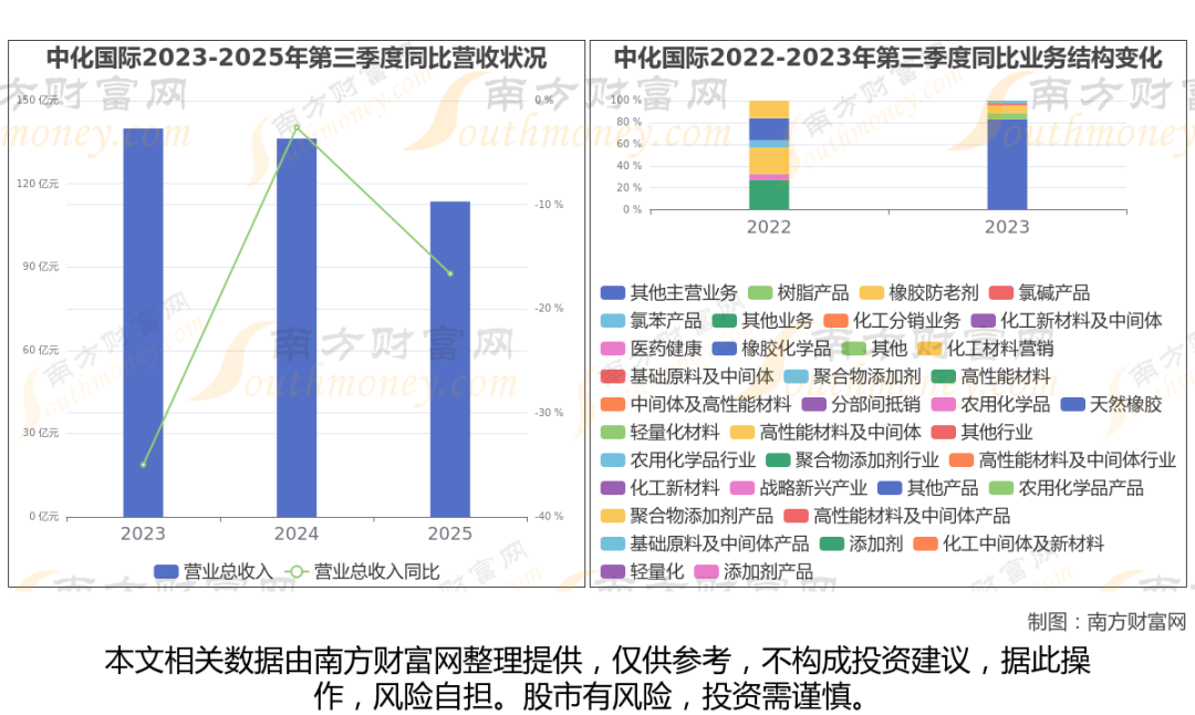 于2025年第三季度,中化国际披露了其业绩表现(如上图),其中主营业务收入113.63亿元,相较于去年同期-16.63%。