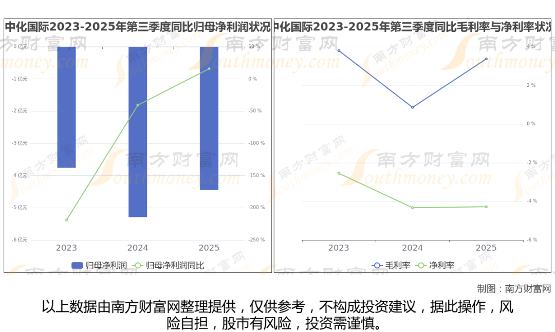 公司2025年第三季度季报显示,中化国际实现净利润-4.45亿,同比增长15.77%;毛利润为3.83亿,毛利率3.37%。